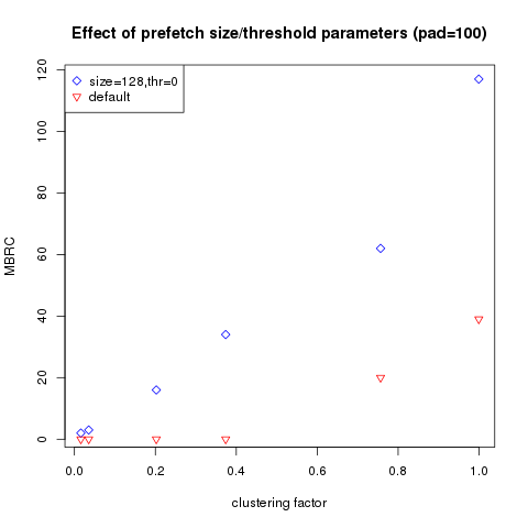 This is a completely different picture! With the exception of one anomalous point (which even shows scattered reads which are hardly to be expected here) we can see multiblock reads come and go exactly as we switch the clustering factor min and max values!