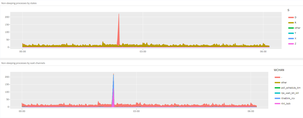 Last year I’ve spent quite some time tackling various memory fragmentation issues on an Exadata cluster (I’ve described some of my experiences here and here). In the end, everything was resolved, and the symptoms went away, but only to come back in a different form a few months later. First we had a minor episode months ago — some applications experienced timeouts when trying to connect, and there was a massive spike in Load Average metric with hundreds of processes in the “D” state stuck on rtnetlink_rcv and rtnl_lock. Then everything became stable again, until a few weeks ago, when the same symptoms came back, but the impact became much more severe, with node evictions, reboots and failovers causing serious disruption for the application.